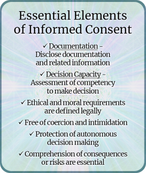 Dada la importancia del Consentimiento Informado para la protección de los Derechos Humanos y como doctrina ética, se aplica a las Leyes Universales en la petición de exigir verdades fácticas de hechos exactos revelados a la población humana en caso de una divulgación completa. En este momento en el planeta Tierra, el consentimiento informado es inexistente ante los grandes eventos globales diseñados para la esclavitud mundial y las agendas genocidas de entidades extradimensionales. Por lo tanto, todas las personas interesadas en servir al movimiento de divulgación pueden beneficiarse de la comprensión de los principios superiores del consentimiento informado y la falta de este, a fin de abrir un diálogo sobre las implicaciones éticas que esto ha tenido contra la raza humana, a medida que la demanda de una divulgación completa se hace más fuerte y se vuelve más unificada. En este punto, la falta de consentimiento informado como resultado de la no divulgación de eventos verdaderos y precisos en este planeta, establece un abuso negligente grave, que puede conducir directamente a la aniquilación genética de múltiples especies, así como a otras consecuencias devastadoras. [1]