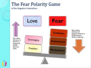 En algún momento es útil darse cuenta de que la realidad actualmente aceptada de los comportamientos del Ego Negativo y la Frecuencia del Miedo, han sido utilizados en contra de las personas de la Tierra como un arma psicológica, para debilitarlas. El miedo se transmite por todas partes en nuestro entorno y esto ha producido personas no confiables para sostener relaciones en nuestro entorno. El miedo debilita el carácter moral y atrofia los atributos superiores de generosidad, bondad y tolerancia hacia los demás. La fabricación de enemigos sin fin en los medios de comunicación dominantes mantiene la percepción masiva de amenazas continuas, que condicionan más miedos e impotencia aprendida en la Mente Inconsciente y el Cuerpo de Dolor de la humanidad. La transmisión del miedo penetra en nuestras vidas personales, infectando nuestros pensamientos, comportamientos y relaciones con la Frecuencia del Miedo. La Frecuencia del Miedo produce sentimientos y percepciones de que somos no confiables, que estamos inseguros dentro nuestro y que no estamos a salvo con los demás. Saber que vivimos en un planeta encarcelado a través de la transmisión masiva de la Frecuencia del Miedo, puede ser útil para desenredarnos de las transmisiones del miedo y las reacciones basadas en el miedo de las personas que nos rodean. Rehúsa asumir y usar la Frecuencia del Miedo que exista externamente, a tu alrededor. Cuando podemos ver las agendas de miedo operando en el entorno externo, podemos ir hacia adentro y examinar aquello que se esté originando desde nuestro interior. Es importante tomar consciencia de los miedos que puedan haberse asumido al estar con personas regidas por el miedo, así como observar las agendas externas que utilizan formas de acoso electrónico y control mental sostenido por los medios. [1]
